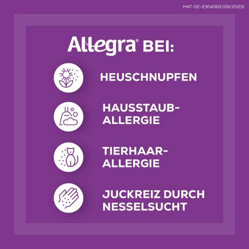 Allegra® Allergietabletten lindern allergische Symptome an Nase, Augen oder Haut, die im Zusammenhang mit Heuschnupfen, Hausstaub- und Tierhaar-Allergie sowie