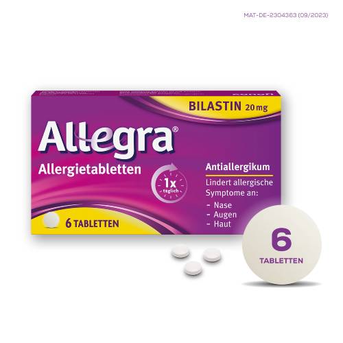 Allegra® Allergietabletten 20 mg Tabletten. Wirkstoff: Bilastin. Anwendungsgebiet: Antihistaminikum. Zur Linderung der Beschwerden allergischer Rhinokonjunktivitis und Urtikaria. Apothekenpflichtig.