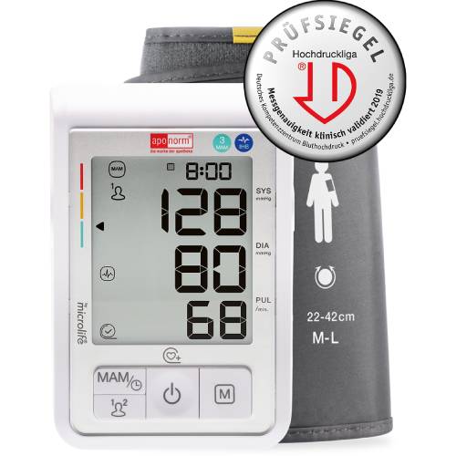 Das aponorm® Basis Control PLUS ist der Mehrfachmess-Spezialist unter den Blutdruckmessgeräten: Nur ein Knopfdruck genügt und das Modell führt mit nur kurzer Pausenzeit dazwischen hintereinander weg eine automatische Mehrfachmessung an Ihnen durch (Einzelmessung wahlweise möglich). Aus allen Messungen (mindestens drei, maximal fünf) wird im Anschluss ein gewichteter Mittelwert gebildet. Dieser ist nach Empfehlungen von Ärzten und Fachverbänden noch etwas genauer als ein Blutdruckwert, der nach einer Einfachmessung ermittelt wird. Und auch sonst bringt das Modell alles mit, was Sie für eine verlässliche Blutdruckmessung benötigen.