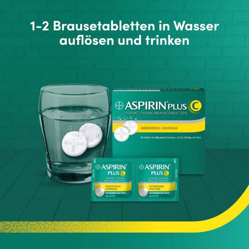 Die Aspirin plus C Brausetabletten werden zur raschen Linderung leichter bis mittelschwerer Schmerzen angewendet. Die Brausetabletten enthalten 400mg des Wirkstoffes Acetylsalicylsäure, sowie Vitamin C. Durch die Acetylsalicylsäure wird die Bildung von Prostaglandine gehemmt, wodurch es zu einer schmerzlindernden und entzündungshemmenden Wirkung kommt. Das Vitamin C wirkt sich zusätzlich positiv auf das Immunsystem aus und sorgt dafür, dass der Wirkstoff bereits beim Auflösen im Wasser aktiviert wird. Dadurch, dass die Aspirin plus C Brausetabletten bereits im gelösten Zustand im Magen ankommen, kommt es zu einem rascheren Wirkungseintritt.