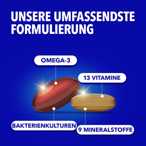 - UNSERE UMFASSENDSTE FORMULIERUNG: Zur Unterstützung deines Wohlbefindens, eine Kombination aus 1 Multivitamin-Tablette mit 13 Vitaminen und 9 Mineralstoffen sowie 1 Omega-3-Kapsel, zur Unterstützung von Herz1, Gehirn2 und Sehkraft3 & Bakterienkulturen.