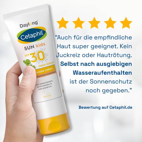 Cetaphil Sun Daylong Kids Liposomale Lotion SPF 30 ist ein dermatologischer Sonnenschutz speziell für die besonderen Ansprüche von empfindlicher Baby- und Kinderhaut (auch bei Neurodermitis geeignet). Die photostabilen UV-Filter bieten einen hochwirksamen und sofortigen UVA- und UVB-Schutz und beugen sonnenbedingten Hautschäden1 vor. Die Sonnencreme mit hohem Lichtschutzfaktor ist frei von Duftstoffen und extra wasserfest in Süß- und Salzwasser. Dank ihrer liposomalen Eigenschaften zieht sie schnell ein, klebt nicht und ist leicht verteilbar. 98% der Konsumenten empfehlen Cetaphil Sun Daylong Kids weiter.2