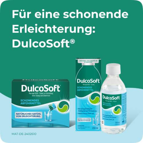 Eine träge Verdauung oder Verstopfung kann die Lebensqualität deutlich beeinträchtigen. Typische Begleiterscheinungen sind Blähungen, Bauchschmerzen und Völlegefühl sowie Schmerzen beim Stuhlgang. DulcoSoft® Lösung mit dem Inhaltsstoff Macrogol 4000 wirkt direkt im Darm, wo sie die natürliche Darmtätigkeit unterstützt und so zu einem regelmäßigen, angenehmeren Stuhlgang beiträgt.