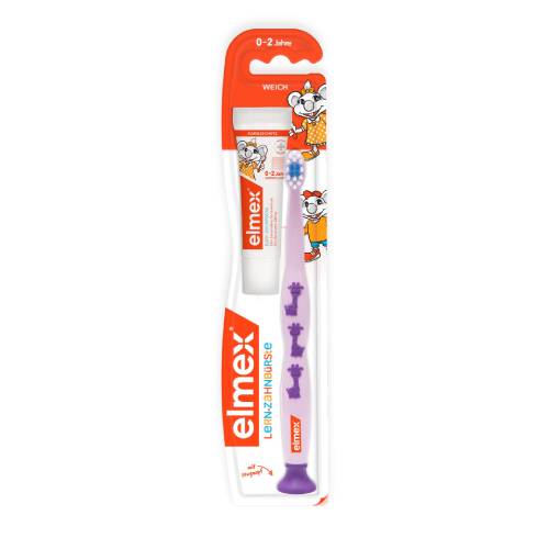 Die Elmex Lernzahnbürste wird zur speziellen und optimalen Zahnpflege von Säuglingen und Kleinkindern angewendet. Die Lernzahnbürste besteht aus einem ergonomisch geformten Griff und einem planen Borstenfeld. Kinder nehmen oftmals zuckerhaltige Speisen und Getränke zu sich. Deshalb ist es sinnvoll, bereits ab dem 1. Zahn mit der regelmäßigen Mundhygiene zu beginnen. Milchzähne brauchen besonderen Schutz, weil sie einen weicheren, noch nicht vollständig ausgereiften Schmelz besitzen. Nur gesunde Milchzähne sind gute Platzhalter für die nachfolgenden, bleibenden Zähne. Das plane Borstenfeld mit optimal abgerundeten Schon-Borsten dient zur effektiven Reinigung der bei Kleinkindern am meisten kariesgefährdeten Kauflächen.