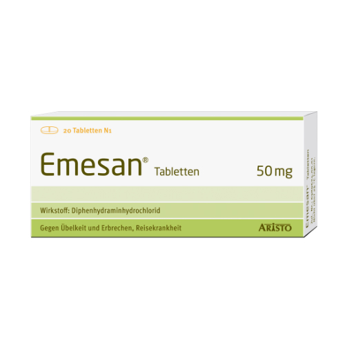 Die Emesan Tabletten werden zur Behandlung von Schwindelzuständen und Übelkeit angewendet. Die Tabletten enthalten den Wirkstoff Diphenhydramin. Zu Schwindel und Übelkeit kommt es häufig durch eine Störung der Funktion des Gleichgewichtsorgans. Bei dem Wirkstoff handelt es sich um ein Antihistaminikum, welches in der Lage ist die Wirkung des Histamins zu blockieren und somit die Reize vom Gleichgewichtsorgan fern zu halten. Außerdem üben die Emesan Tabletten einen direkt hemmenden Effekt auf das Brechzentrum im Gehirn aus, wodurch sie auch zur Behandlung von Übelkeit und Erbrechen anderer Ursachen geeignet sind.