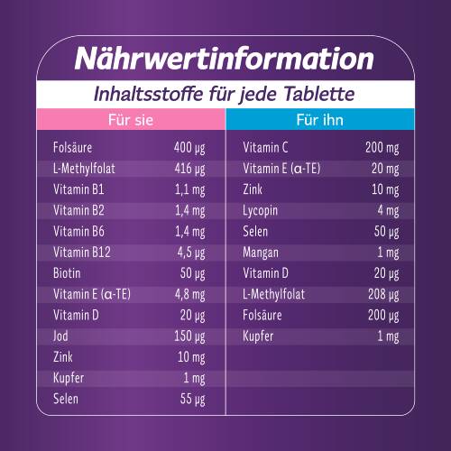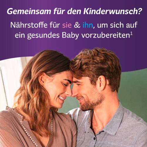 Femibion für sie & ihn ist ein Nahrungsergänzungsmittel, das Paare dabei unterstützt²,³, sich auf die Empfängnis vorzubereiten, von dem Moment an, in dem der Wunsch nach einem Baby entsteht. Es bietet einen Doppelpack mit einer abgestimmten Formulierung für beide Partner und enthält wichtige Nährstoffe, die zur Fruchtbarkeit², Reproduktion² und zur gesunden Entwicklung des Babys¹ beitragen.