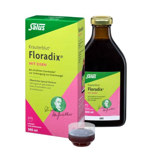 Floradix mit Eisen: Wirkstoff: Eisen(II)-gluconat. Anwendungsgebiet: Bei erhöhtem Eisenbedarf, wenn ein Risiko für die Entstehung eines Eisenmangels erkennbar ist. Ein erhöhter Eisenbedarf besteht insbesondere bei erhöhtem Eisenverlust, z.B. bei der Menstruation. Weiterhin besteht ein erhöhter Eisenbedarf während der Schwangerschaft und Stillzeit sowie in der Erholungszeit nach Krankheiten. Enthält Fructose und Invertzucker. Bitte Packungsbeilage beachten. Zu Risiken und Nebenwirkungen lesen Sie die Packungsbeilage und fragen Sie Ihren Arzt oder Apotheker.