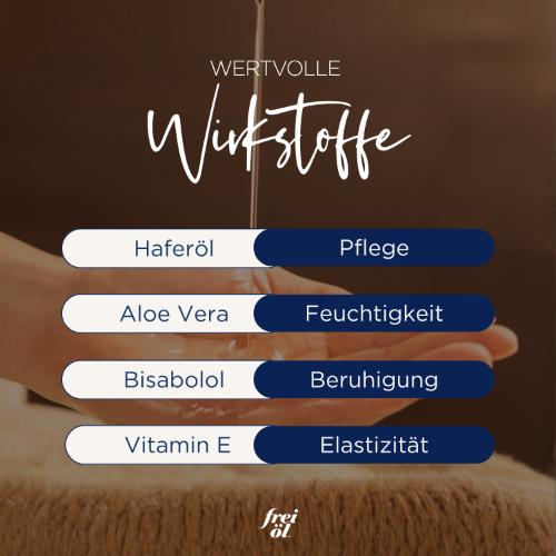 Wertvolle Inhaltsstoffe wie Hafer-, Mandel-, Jojoba-, Weizenkeimöl sowie Aloe vera und PCA pflegen die Haut intensiv und bewahren zusätzlich Feuchtigkeit.