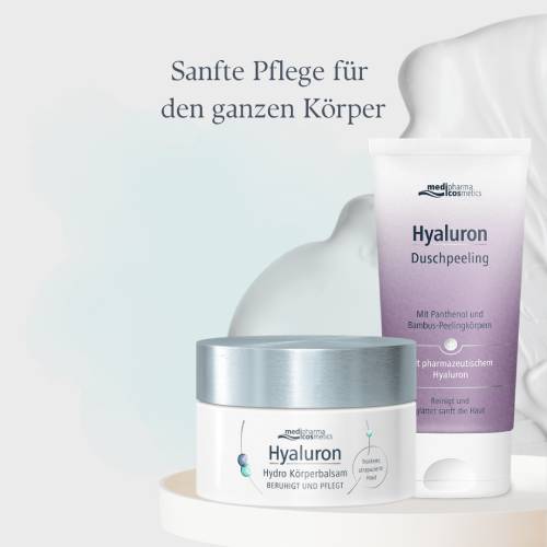 Der Hyaluron Hydro Körperbalsam von medipharma cosmetics ist eine reichhaltige Pflege, die mit Hyaluronsäure und Jojobaöl zum Schutz der natürlichen Hautschutzbarriere beiträgt.