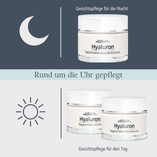 Medipharma cosmetics Hyaluron Nachtcreme: Regenerierende Pflege für normale bis trockene Haut, die in der Nacht Fältchen mildert und die Haut natürlich aufpolstert.