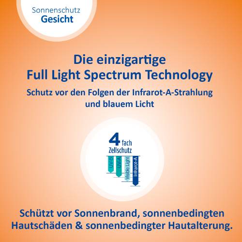 Sonnenstrahlen gibt es in verschiedenen Wellenlängen. Sie haben verschiedene Auswirkungen auf die Haut, wirken jedoch alle zellschädigend. Daher ist es wichtig einen Sonnenschutz zu verwenden, der rundum schützt. Dank einzigartigem 4-fach Zellschutz schützt die Ladival® Empfindliche & Normale Haut Sonnenschutz-Lotion vor UV-A- und UV-B-Strahlen, vor den Folgen der Infrarot-A-Strahlung und sichtbarem Licht (einschließlich blauem Licht). So wird die Haut auch vor einer vorzeitigen, sonnenbedingten Hautalterung geschützt.