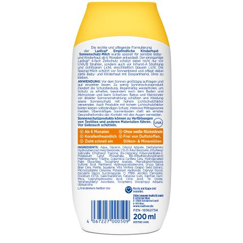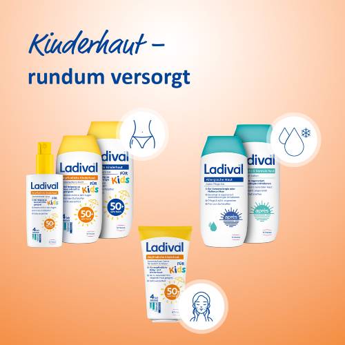 LADIVAL® EMPFINDLICHE KINDERHAUT SONNENSCHUTZ-MILCH LSF 50+ Ganzjähriger Sonnenschutz ist essenziell, da er nicht nur vor Sonnenbrand schützt, sondern auch das Risiko an Hautkrebs zu erkranken reduziert. Kinderhaut ist besonders empfindlich gegenüber schädlichen UV-Strahlen und benötigt daher besonderen Schutz – vor allem, da Kinder viel Zeit im Freien verbringen. Ladival® bietet hierfür die Empfindliche Kinderhaut Sonnenschutz-Milch mit einem sehr hohen Lichtschutzfaktor von 50+, speziell formuliert für die empfindliche Haut von Kindern und Babys ab 6 Monaten.