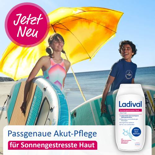 Nach dem Sonnenbaden ist es wichtig, die sonnengestresste Haut optimal zu pflegen und ihre Feuchtigkeitsspeicher aufzufüllen. Sollte Ihre Haut von der Sonne gereizt sein und empfindlich reagieren, verschafft die Ladival® Sonnengestresste Haut Akut-Serie schnell Linderung. Diese wurde speziell für UV-gereizte Haut entwickelt und unterstützt die hauteigene Zellregeneration mit dem Algen-Enzym Photolyase.