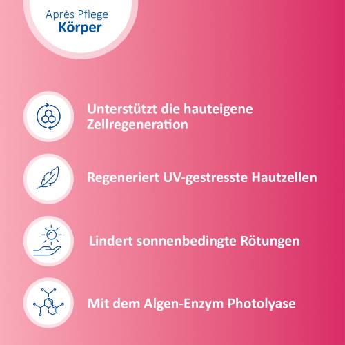 Photolyase ist ein natürliches Enzym, das aus der Blaualge gewonnen wird. In Produkten wie der Ladival® Sonnengestresste Haut Akut-Serie wird es eingesetzt, um die Regeneration sonnenstrapazierter Haut zu unterstützen. Nach Sonneneinstrahlung hilft die Photolyase, DNA-Schäden durch UV-Strahlung zu reparieren, indem es verklebte DNA-Basen auflöst, was zu einer Beruhigung von sonnenbedingten Rötungen und Spannungsgefühlen führt. Es nutzt den natürlichen Mechanismus der Photoreaktivierung, um Hautschäden durch UV-B-Strahlung zu vermeiden und die hauteigene Regeneration zu fördern, sowohl während als auch nach der Sonnenexposition.