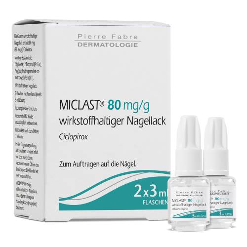 MICLAST® Nagellack ist ein effektives Breitband-Antimykotikum mit dem Wirkstoff Ciclopirox. Dieser Wirkstoff ist gegen eine Vielzahl von Pilzarten (Dermatophyten, Hefen, Schimmelpilze) wirksam. Für den Wirkstoff Ciclopirox konnten Wissenschaftler unter Laborbedingungen an Zellkulturen zudem eine Wirkung gegen Pilzsporen und Bakterien nachweisen.Nach dem Auftragen des Nagellacks entfaltet sich ein WIRKSTOFF-BOOST: Das Lösungsmittel verdunstet und die Wirkstoffkonzentration erhöht sich von 8% auf 35%. Die hohe Wirkstoffkonzentration sorgt dafür, dass der Wirkstoff schnell in den Nagel penetriert und so gründlich vom Nagelpilz befreit.MICLAST® Nagellack ist im Vergleich zu anderen wirkstoffhaltigen Nagellacken wasserfest. So verbleibt es auch nach dem Hände-/Füßewaschen auf dem Nagel und kann dort weiterhin wirken. Er wird 1x täglich angewendet, was eine entscheidende Voraussetzung für den Therapieerfolg ist, da die Behandlung zur täglichen Routine wird. So erklärt sich auch die vergleichsweise kurze Therapiedauer mit MICLAST® Nagellack: Diese beträgt in der Regel 3 Monate (bei Fingernägeln) bis 6 Monate (bei Fußnägeln).