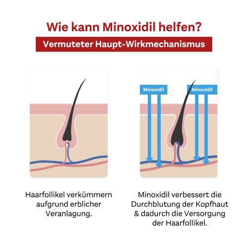 Beim anlagebedingten Haarausfall verkümmern an manchen Stellen der Kopfhaut die Haarfollikel (Haarwurzeln). Durch das Auftragen von MINOXIDIL DoppelherzPharma für Männer direkt auf die Kopfhaut wird das Haarwachstum stimuliert: Lokal erfolgt eine Erweiterung der Blutgefäße und damit eine erhöhte Durchblutung der Kopfhaut. So kann die Blut- und Nährstoffversorgung der Haarfollikel wieder angeregt werden. Dies wird als hauptsächliche Wirkweise von Minoxidil angesehen.