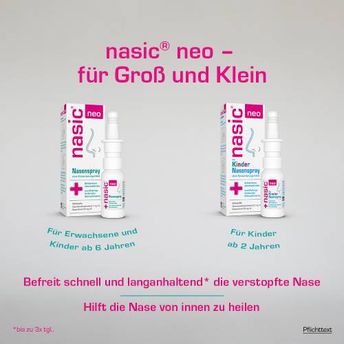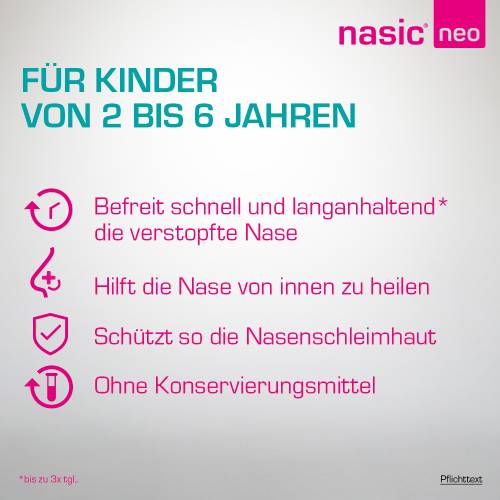 Die ohnehin schon empfindlichen Nasenschleimhäute von Kindern erfordern bei Schnupfen eine besonders schonende Behandlung. Die Wirkstoffkombination aus Xylometazolin und Dexpanthenol in nasic® neo für Kinder lässt die Nasenschleimhaut abschwellen und befreit so die Kindernase. Gleichzeitig pflegt es die Nase und fördert die Heilung der Schleimhäute. Dabei ist es frei von Konservierungsstoffen.