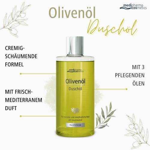 Erleben Sie ein wohltuendes Duscherlebnis, das Ihre Haut sanft umhüllt und Sie mit einem Hauch von mediterraner Frische verwöhnt. Das Olivenöl Duschöl von medipharma cosmetics verwandelt sich nach der Berührung mit Wasser in einen zarten, cremigen Schaum, der sich wie ein sanfter Mantel über Ihre Haut legt und für ein geschmeidiges Gefühl sorgt.