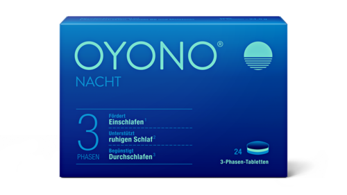 OYONO® ist eine innovative 3-Phasen-Tablette aus ausgewählten pflanzlichen Inhaltstoffen kombiniert mit dem körpereigenen Stoff Melatonin. Das Besondere an dem Nahrungsergänzungsmittel OYONO® ist, dass die enthaltenen Inhaltstoffe nicht gleichzeitig, sondern zeitlich versetzt in drei Phasen freigesetzt werden.