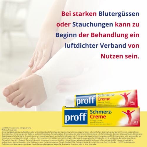 proff® Schmerzcreme – Seit 1983 in Deutschland zugelassen Schmerzen in Muskeln oder Gelenken können den Alltag stark einschränken. proff® Schmerzcreme wird äußerlich angewendet und wirkt lokal am betroffenen Bereich. Bereits seit 1983 in Deutschland zugelassen, zählt proff® Schmerzcreme zu den ersten topischen Arzneimitteln mit dem Wirkstoff Ibuprofen.