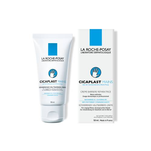 Die reparierende Hautbarriere-Creme CICAPLAST HÄNDE von La Roche-Posay für alle rissigen und strapazierten Hände. Sie bietet angenehmen Schutz und Pflege und mildert Hautirritationen und Rötungen bei Trockenheit der Haut. Besonders angenehm ist das sofortige Einziehen nach dem Auftragen. Die Hautcreme enthält beruhigendes Thermalwasser und Karitébutter. Dadurch werden Spannungsgefühle reduziert und die Haut wird vor Feuchtigkeitsverlust geschützt. Weiterer Schutz wird durch eine Glycerin-Formel gewährleistet. Diese bildet sofort eine schützende Barriere auf der Haut und verhindert nachhaltig das Austrocknen besonders empfindlicher Stellen, wie zum Beispiel den Fingerkuppen oder -knöcheln. Diese Funktion wird durch den Inhaltsstoff Niacinamid unterstützt, der vor allem die Beschwerden von geröteten und irritierten Händen mildert. Trotz all dieser Eigenschaften zieht die reparierende Hautbarriere-Creme schnell ein und hinterlässt keine Rückstände.