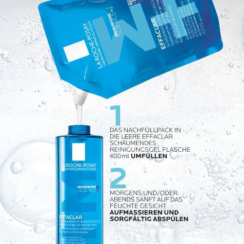 Anwendungshinweis: La Roche Posay EFFACLAR Schäumendes Reinigungsgel Nachfüllpack in die leere 400ml Flasche umfüllen. Täglich am Morgen und/oder am Abend anwenden. Die Haut mit lauwarmem Wasser anfeuchten, um die Poren zu öffnen. Die Reinigung in den Händen verteilen, auf T-Zone und Hals auftragen und sanft mit kreisenden Bewegungen einmassieren. Die Rückstände anschließend gründlich mit kaltem Wasser abspülen, um die Poren wieder zu schließen.