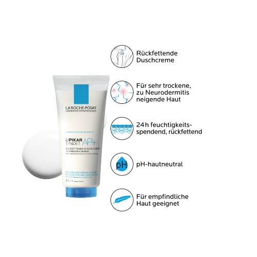 Die LIPIKAR Syndet AP+ Dusch-Creme von La Roche-Posay ist eine Körperreinigung ohne Duftstoffe. Das sanft reinigende Cremegel eignet sich als Basispflege zum Duschen bei zu Neurodermitis neigender, empfindlicher und sehr trockener Haut. Durch die rückfettende Eigenschaft wirkt die LIPIKAR Syndet AP+ Dusch-Creme hautberuhigend und juckreizlindernd. Es ist für Säuglinge, Kinder und Erwachsene geeignet. Angereichert mit Niacinamid und dem Wirkstoff Aqua Posae Filiformis lindert LIPIKAR Syndet AP+ den Juckreiz bereits unter der Dusche. Die in der Formulierung enthaltene Sheabutter pflegt empfindliche Haut zusätzlich.