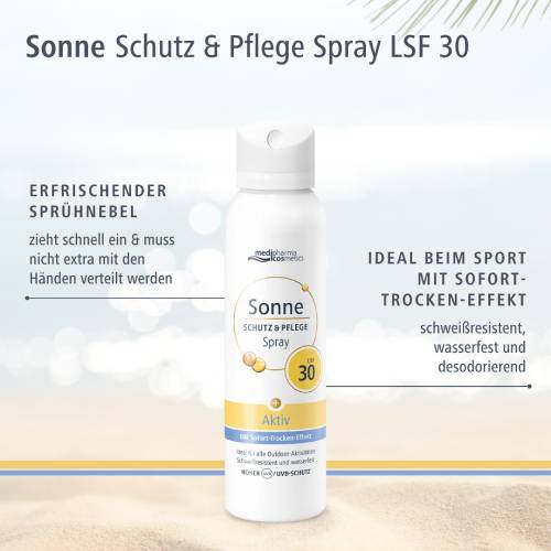 Sonne Schutz&Pflege Aerosol-Spray aktiv mit LSF 30 von medipharma cosmetics: Zuverlässiger Sonnenschutz für unterwegs und bei Outdoor-Aktivitäten