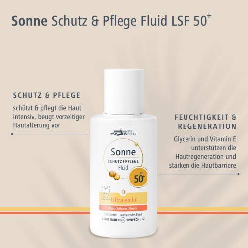 Das Sonne Schutz&Pflege Fluid mit LSF 30 von medipharma cosmetics schützt täglich vor Sonnenschäden und vorzeitiger Hautalterung.  Mit seiner leichten Textur, schnellen Absorption und den pflegenden Inhaltsstoffen bietet es einen komfortablen und zuverlässigen Schutz für jede Gelegenheit. Genießen Sie die Sonne mit dem sicheren Gefühl, dass Ihre Haut optimal geschützt und gepflegt wird.