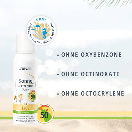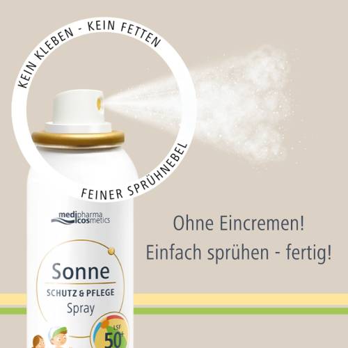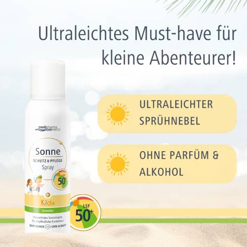 Das wasserfeste Sonnenspray Schutz & Pflege Kids mit LSF 50+ von medipharma cosmetics für empfindliche Kinderhaut ist eine leichte Emulsion mit sehr hohem und zuverlässigem Sonnenschutz.