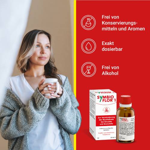 Die in Symbioflor® 1 enthaltenen natürlichen Darmbakterien, nämlich Enterococcus faecalis, aktivieren Immunzellen im Darm, dem größten menschlichen „Immunorgan“, wo die Mehrzahl der Abwehrzellen angesiedelt ist. Nach ihrer Aktivierung wandern diese Immunzellen durch den Blutkreislauf und erreichen verschiedene Teile des Körpers, einschließlich der Atemwege. Dort angekommen, tragen sie zur Stärkung der Abwehr an den Schleimhäuten der Bronchien und Nasennebenhöhlen bei. Dies führt zur Verringerung der Rückfallrate von wiederkehrenden Atemwegserkrankungen wie z.B. Bronchitis und Sinusitis. Der ganzheitliche Ansatz zeigt, dass der Darm einen wesentlichen Bestandteil für ein gesundes Immunsystem darstellt und z.B. den Ansatzpunkt für die Prävention von wiederkehrenden Atemwegserkrankungen bildet. Symbioflor® 1 ist frei von Konservierungsstoffen, Aromen und Alkohol und bietet eine exakte Dosierbarkeit.