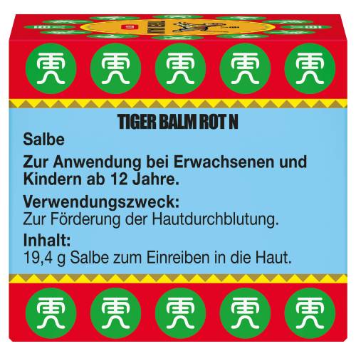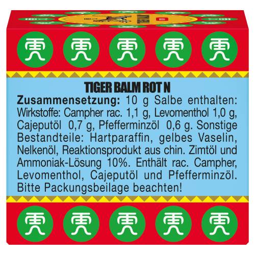 Tiger Balm Rot N, Salbe. Für Erwachsene und Jugendliche ab 12 Jahren. Wirkstoffe: Campher racemisch, Levomenthol, Cajeputöl, Pfefferminzöl. Anwendungsgebiet: Zur Förderung der Hautdurchblutung. Warnhinweise: Enthält Campher racemisch, Levomenthol, Cajeput- und Pfefferminzöl.