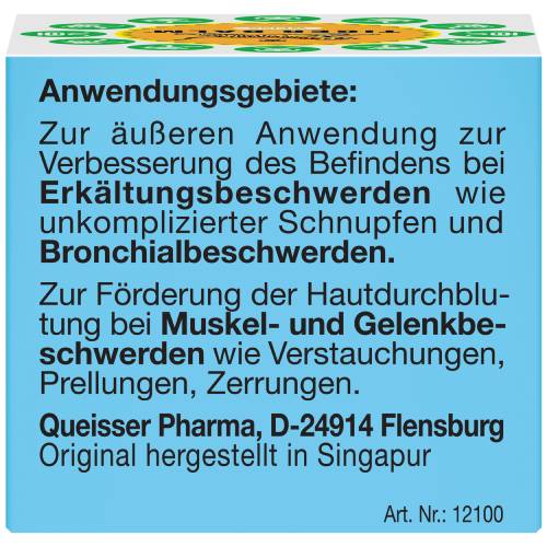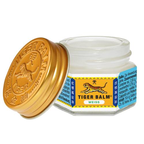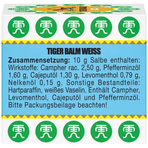Tiger Balm Weiss, Salbe. Für Erwachsene und Jugendliche ab 12 Jahren. Wirkstoffe: Campher racemisch, Levomenthol, Nelkenöl, Cajeputöl, Pfefferminzöl. Anwendungsgebiete: Zur äußeren Anwendung zur Verbesserung des Befindens bei Erkältungsbeschwerden wie unkomplizierter Schnupfen und Bronchialbeschwerden. Zur Förderung der Hautdurchblutung bei Muskel- und Gelenkbeschwerden wie Verstauchungen, Prellungen, Zerrungen. Warnhinweise: Enthält Campher racemisch, Levomenthol, Cajeput- und Pfefferminzöl.