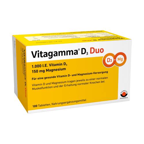 Pflichtangaben: Vitagamma® D3 Duo. Nahrungsergänzungsmittel. Zusammensetzung: 1.000 I.E. Vitamin D3 u. 150 mg Magnesium pro Tabl. Hinweis: Die angegebene empfohl. Verzehrmenge darf nicht überschritten werden. Nahrungsergänzungsmittel sollten nicht als Ersatz für eine ausgewogene Ernährung u. gesunde Lebensweise verwendet werden. Apothekenexklusiv. Wörwag Pharma GmbH & Co. KG, 71034 Böblingen